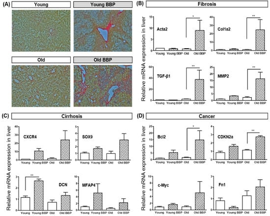 3.4. Effects of BBP on Hepatic Fibrosis in Aged Mice