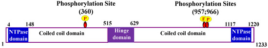 Schematic diagram for SMC1A showing the phosphorylation sites and domains of SMC1A. Phosphorylation sites include Ser360, Ser957 and Ser966. Phosphoserine S957 and S966 are shown to be phosphorylated by ATM and ATR [16,17,34]. Domains included coiled-coil domain, hinge-domain, and NTPase domains at N- and C-terminus of SMC1A.