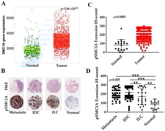Comparison of SMC1A expression in breast tumor and normal tissues was performed by mining the integrated database utilizing RNAseq data [36]. TPM count (Transcripts Per Million), a measure of gene expression level, was plotted. The data showed that SMC1A is significantly overexpressed in breast tumor tissues compared to normal samples (from non-cancerous patients and pediatric tissues) (Figure 2A). These results confirmed our previous work and the literature showing overexpression of SMC1A in various cancers [27,28,29,30,31,32,33,34,35,36]. To test the expression and localization of active SMC1A (pSMC1A) in breast tumors, we used histological sections of the breast cancer spectrum (from tissue microarray) and histological slides of TNBC sections including metastatic (lymph nodes or lung metastases originating from breast cancer), invasive ductal (IDC), lobular carcinoma (ILC) and normal or adjacent normal breast tissues. Each section was accompanied by H&E staining, grade, and stage of the tumor (Figure 2B). The clinical and pathological characteristics of the patients, from whom these samples were obtained, are summarized in Table 1.