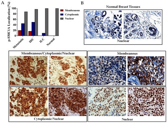 Structural maintenance of chromosome-1A (SMC1A) is overexpressed in various malignancies including triple-negative breast cancer (TNBC). As a core component of the cohesin complex, SMC1A was initially recognized for its involvement in chromosomal cohesion and DNA-repair pathways. However, recent studies have unveiled its pivotal role in epithelial–mesenchymal transition (EMT), metastasis, and chemo- and radio-resistance in cancer cells. In hepatocellular carcinoma, aberrant phosphorylation of SMC1A has been associated with enhanced cell proliferation and migration. Despite these insights, the precise role of SMC1A phosphorylation in breast cancer remains largely unexplored. This study represents the first investigation to test the phosphorylation status and subcellular localization of SMC1A (p-SMC1A) in breast cancer and normal breast tissues. Immunohistochemical (IHC) staining was conducted using previously validated phospho-SMC1A antibodies on a histological section and tissue microarray (TMA) comprising samples from primary, invasive, and metastatic breast cancer and normal breast tissues. Our results revealed that p-SMC1A staining intensity was lower in normal breast tissues compared to invasive or metastatic breast cancer tissues (p < 0.001). Approximately 40% of breast cancer tissue exhibited cytoplasmic/membranous localization of p-SMC1A, whereas nuclear expression was observed in normal breast tissues. Moreover, elevated phosphorylation levels were significantly associated with higher tumor grade and metastasis.