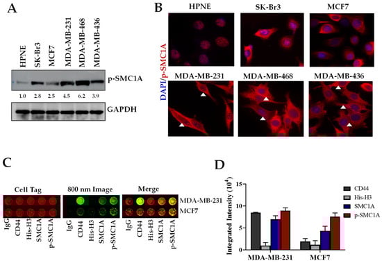 The expression of pSMC1A was tested on a panel of breast cancer and normal epithelial cells by Western blot using p-SMC1A (S966) antibodies (1 mg/mL stock; 1:1000 dilution) as described in the Methods section. Densitometry measurements of the bands in Western blot showed there was two- to five-fold-higher expression of pSMC1A in breast cancer cells as compared to normal epithelial cells (Figure 4A). To test the cellular localization of p-SMC1A, immunocytochemistry was conducted using anti-pSMC1A (S966) antibodies on a panel of breast cancer cells and normal epithelial cells, cultured in 8-well chamber slides as described in the Methods section. Our results showed heterogeneous expression of pSMC1A amongst cancer cells (Figure 4B). In all breast cancer cells tested, pSMC1A was expressed in the nucleus, while there was heterogeneity in cytoplasmic and membranous expression. In a panel of TNBC cells (MDA-MB-436, MDA-MB-468 and MDA-MB-231), pSMC1A was present in the cytoplasm and membrane of cells. In hormone-dependent cell lines SK-Br3 and MCF7), pSMC1A showed membrane/cytoplasmic expression (Figure 4B). Normal epithelial cells (HPNE) showed significantly lower phosphorylation of SMC1A, and phosphorylated protein was expressed mainly in the nucleus (Figure 4B). Surface expression of pSMC1A was further tested in MDA-MB-231 and MCF7 cells by on-cell Western (OCW) assay. The integrated intensity plot showed that pSMC1A was present on the surface of MDA-MB-231 and MCF7 cells with higher intensity in MDA-MB-231 cells (Figure 4C,D). The mean of intensity for MDA-MB-231 was 6.334 and 3.745 for MCF7. Difference in mean intensity between MDA-MB-231 and MCF7 was 2.589 with SE of difference of 0.3814. CI of 95% of difference was 1.710 to 3.469. CD44 and His-H3 antibodies were used as positive and negative controls for surface expression