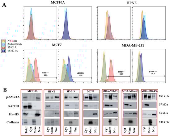 The membranous expression of pSMC1A was further tested on breast cancer and normal epithelial cells by flow cytometry using SMC1A and pSMC1A (Ser966) antibodies as described in the Methods section. Our results showed that both SMC1A and pSMC1A were expressed on the surface of breast cancer cells (MCF7, MDA-MB-231) but not on the normal cells (MCF10A, HPNE) (Figure 5A). Subcellular distribution of pSMC1A was also determined in a panel of breast cancer and normal cells using subcellular protein fractionation kit (Thermo Scientific) following manufacturer’s directions. Appropriate amounts of lysates (~20 µg protein) were resolved over Criterion™ TGX precast gels and transferred onto polyvinylidene difluoride (PDVF) membrane. The blots were probed using pSMC1A and other primary antibodies in 2% BSA in TBST buffer overnight at 4 °C. The details of antibodies are given in Supplementary Table S1. GAPDH, Cadherin (CDH1 or CDH2) and His-H3 were used as cytoplasmic, membrane and nuclear markers. Our results showed that there was heterogeneity in the localization of pSMC1A in the breast cancer cells. Normal epithelial cells (MCF10A and HPNE) showed pSMC1A expression predominantly in the nucleus, while in breast cancer cells, pSMC1A was present in membrane, cytoplasmic, and nuclear fractions (Figure 5B). Overall, these results showed that SMC1A was aberrantly phosphorylated in breast cancer cells and phosphorylated SMC1A mislocalized to the cytoplasm and membrane of some cancer cells.