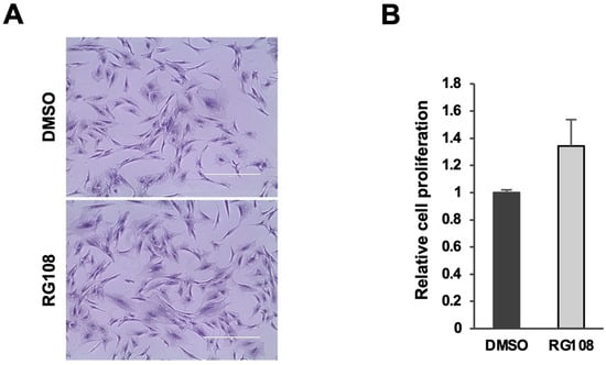 Additionally, RG108 treatment did not induce any toxicity, as no alterations in cell morphology or proliferative capacity were observed. To assess the impact of RG108 on ASC viability and proliferation, cells were treated with 50 µM RG108 or DMSO (as a control) for 72 h. Cell density and morphology were observed via phase contrast microscopy, and proliferation rates were measured using the Trypan blue exclusion test. No significant changes in cell morphology were noted, and the proliferation rates between RG108-treated and DMSO-treated cells remained statistically comparable (RG108/DMSO = 1.34 ± 0.19; p-value not significant) (Figure 1).