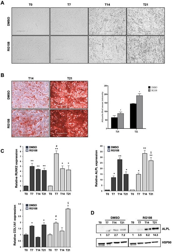 Once cells reached 50–60% confluence, they were cultured in osteogenic differentiation medium StemXVivo® Osteogenic/Adipogenic Base Media (R&D Systems, Minneapolis, MN, USA) with RG108 or DMSO for 24 h (T0 point) before adding the StemXVivo® Human Osteogenic Supplement (R&D Systems) for 7 (T7 time point), 14 (T14 time point), and 21 (T21 time point) days to induce osteogenesis. During differentiation, cells were treated with DMSO or 50 µM RG108 every two days. To assess the morphological changes in ASCs treated with RG108 and then induced to osteogenic differentiation, cells were stained by Alizarin Red-S (Merck, Darmstadt, Germany). Briefly, ASCs, treated with osteogenic medium for 14 and 21 days were fixed in 4% paraformaldehyde for 15 min at room temperature (RT) and stained with 2% Alizarin Red-S (Sigma-Aldrich) for 15 min at RT. Cells in four random fields for treatment were photographed at 20× and 40× magnifications using the EVOS XL Core Imaging System (Thermo Fisher Scientific, Waltham, MA, USA) and analyzed using ImageJ 1.5 software.
