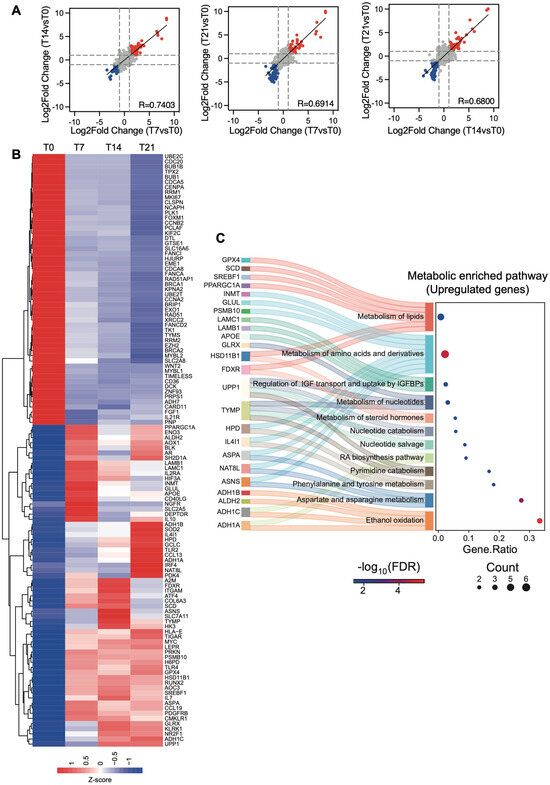 Transcriptional changes during osteogenesis differentiation. (A) Correlation analysis of log2 fold changes at reported time points (T7, T14, and T21) compared to T0. Red dots indicate upregulated genes, while blue dots represent downregulated genes. Dashed lines indicate log2 fold change thresholds, set at +1 and −1. (B) Cluster heatmap of upregulated and downregulated genes at distinct time points (T0, T7, T14, and T21) identified in (A). Expression values are reported as Z-score. (C) River plot of metabolic gene set enrichment analysis (REACTOME v2024.1) of upregulated genes. The gene ratio of upregulated genes to total genes in the different pathways is reported. Significance is reported as −log10 (FDR) and indicated with color gradient.