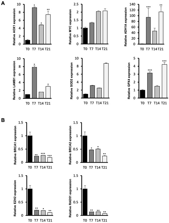 Among the upregulated genes, we selected AOX1, which has been recently identified as a potential osteogenic marker in human mesenchymal stem cells [52], MYC, which promotes BMP2-dependent osteogenesis in human MSCs [53], ADH1A, which regulates IGF transport and uptake as well as ECM organization, and SOD2 and GPX4, two genes involved in ROS detoxification, a key mechanism for reducing ROS levels produced during differentiation (Figure 5A). AOX1 shows an expression pattern consistent with its role as an osteogenic marker. The robust increase in the early phase (9.1-fold vs. T0) indicates that osteogenic commitment is quickly and successfully initiated, and that this upregulation is maintained throughout the differentiation period, with only a slight physiological decrease in expression levels toward the later stages, which does not hinder the success of differentiation. LAMB1 displays a peak in expression at the early T7 time point (7.8-fold vs. T0), and ECM rearrangement is likely a cellular response to the changes required during the cell commitment phase for osteogenic differentiation. As for the antioxidant genes SOD2 and GPX4, their expression increases throughout the differentiation process, with peaks at the T21 time point (8.7-fold and 4.2-fold vs. T0, respectively) corresponding to the final phase of osteogenic differentiation. This peak in expression aligns the need for antioxidant action with the accumulated ROS production during the earlier phases. Among the downregulated genes, we tested BRCA1, BRCA2, EZH2, and RAD51, all of which are involved in DNA damage repair and expected to be downregulated in non-proliferating cells (Figure 5B). Indeed, these genes exhibit strong downregulation from the early stages of osteogenic commitment, with the most significant reduction observed at the T21 time point (0.18-fold, 0.24-fold, 0.1-fold, and 0.07-fold vs. T0, respectively). This is consistent with the non-proliferative state of the cells in the final stage of osteogenic differentiation.