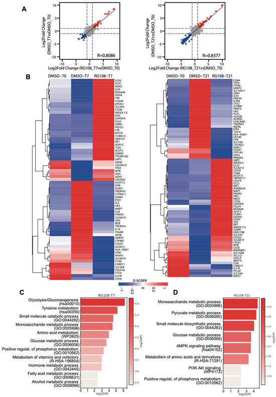 Transcriptional changes during osteogenesis differentiation of ASCs treated with RG108. (A) Correlation analysis of log2 fold changes in ASCs treated or not with RG108 at reported time points (T7, T21) compared to T0. Red dots indicate upregulated genes, blue dots indicate downregulated genes. Dotted lines indicate log2 fold change thresholds set at +1 and −1. (B) Cluster heatmap of upregulated and downregulated genes after RG108 treatment at distinct time points (T0, T7, and T21) identified in (A). Expression values are reported as Z-score. (C) Graph bars of enriched pathways for RG108 T7-upregulated genes calculated with Metascape tool. X axis shows significance reported as −log10 p value (p). (D) Graph bars of enriched pathways for RG108 T21-upregulated genes calculated with Metascape tool. X axis shows significance reported as −log10 p value (p).