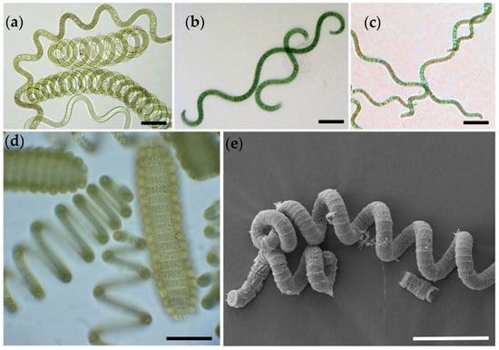 In this study, we focused on the cyanoprokaryote Limnospira fusiformis, formerly known as Spirulina platensis and Arthrospira fusiformis []. Nowadays, the genus Spirulina is placed in the order Spirulinales, as it differs from Limnospira both phylogenetically and cytologically []. Limnospira fusiformis is placed in the order of Oscillatoriales. Cells are arranged in unbranched trichomes with visible cross walls (Figure 1). The trichomes are mostly coiled; filaments have a diameter of approximately 7 to 10 µm, the spirals 20 to 50 µm. Limnospira, however, changes its morphology from densely coiled filaments to wavy formed trichomes to completely straight forms [,]. Natural habitats are East African soda lakes, where it thrives under high pH, high salinity, and high turbidity []. The cyanobacterium is rich in proteins, minerals, essential fatty acids, carotene, and vitamin B12 analogous, and has a wide range of applications, including as feed for animal farming and aquaculture, and in recent years, as food additive for humans [].