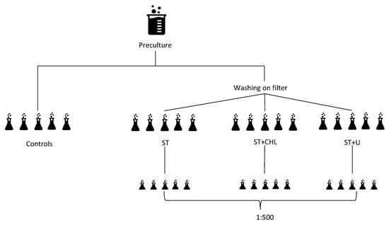 Working steps of the axenic treatments are shown in Figure 2. Treatment started with rinsing the filaments on membrane filters with bicarbonate-free Zarrouk medium (Isopore hydrophilic polycarbonate, 3 µm pore size, Merck KGaA, Darmstadt, Germany) to get rid of most contaminants in the liquid medium. The filaments were then transferred into Erlenmeyer flasks and split into three groups (Figure 2), each group containing five replicates. The groups were then subjected to different axenic treatments (Table 1): (1) standard treatment (ST), (2) ST + chloramphenicol and glucose (ST + CHL), and (3) ST with ultrasonication (ST + U). ST followed the protocol of Sena et al. []: the pH was raised to 12 by adding 1 M NaOH drop by drop and the samples were then kept for 72 h at pH 12 to exacerbate living conditions for unwanted heterotrophic bacteria. To replace the alkaline medium with full Zarrouk medium, three centrifugation cycles of 10 min each at 3000 rcf and 20 °C were performed. After each cycle, the medium was replaced, and the pellet dispersed by vortexing. After this step, one group was treated with an additional ultrasonication step (ST + U) to remove bacteria attached to the filament surface of Limnospira. Samples were subjected to 12 × 10 s rounds of ultrasonication (Sonifier 250, Branson, Danbury, Connecticut) at the lowest intensity with ice water cooling intervals of 30 s between rounds. The detached mucus was removed by 3 × 10 min centrifugation cycles as previously described. All samples were then treated with four different antibiotics: ampicillin (61.6 µg mL−1), penicillin (85.8 µg mL−1), cefoxitin (76.9 µg mL−1) and meropenem (38.9 µg mL−1). For the group with chloramphenicol addition (ST + CHL), 10.0 µg mL−1 chloramphenicol was added as well as 100 µg mL−1 glucose. After 48 h of cultivation in the dark, three centrifugation cycles were performed as mentioned above to remove the antibiotics from the medium, followed by a 1:500 dilution to enhance the chance of bacteria-free cultures. Untreated control samples were included for comparison with axenic treatments.