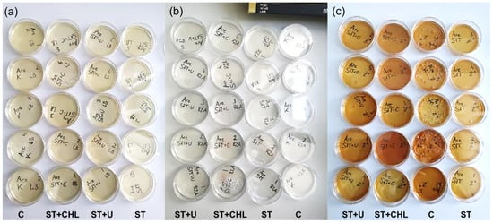 Plates 3 days after inoculation: (a) No colonies are visible for any of the treatments on LB medium. (b) In R2A medium, a few bacterial colonies were monitored for all treatments with highest contaminations in controls (red clusters). (c) Contamination was confirmed across all treatments on agar plates with Zarrouk+ medium. Abbreviations indicate steps to reach axenicity: C = control without dilution, ST = standard treatment, ST + CHL = standard treatment + chloramphenicol, and ST + U = standard treatment + ultrasonication.