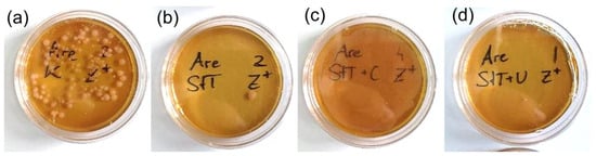 Zarrouk+ medium after 3 days inoculation: (a) control, (b) standard treatment (ST): single distinct colony, (c) ST + chloramphenicol (ST + C): “nebula” of colonies, and (d) ST + ultrasonication (ST + U): single tiny colonies.