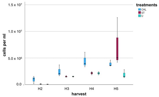 Boxplot of FCM cell counts of treated cultures for each harvest (H2 = 3 days, H3 = 1 week, H4 = 2 weeks, H5 = 4 weeks after completion of treatment, n = 3). CHL = standard treatment + chloramphenicol, ST = standard treatment, and U = standard treatment + ultrasonication. For better visibility, controls containing approximately 4.5 E5 cells mL−1 were excluded.