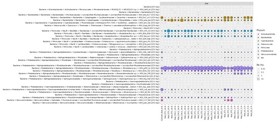 Sample names include the different replicates that were used together with the date on which they were sampled. 16.8. is H2, 22.8. is H3 and 5.9. is H4. Bubbles indicate the contamination found in each sample with different sizes and colors corresponding to the fraction of reads per library RA (%) and the phylum each amplicon sequence variant (ASV) was assigned to, respectively. Fractions displayed for higher taxonomic ranks exclude those for separately shown lower taxonomic ranks.