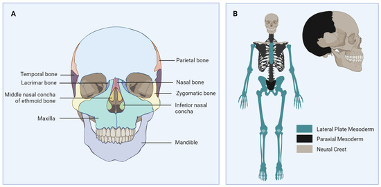 The human facial skeleton is formed by fourteen bones (Figure 2A). The mandible and vomer are standalone bones in the maxillofacial complex. Any parts of the facial skeleton originate from neural crest stem cells.