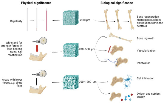 Graphical representation of physical and biological significance of various pore sizes. Graphical representation of physical and biological significance of various pore sizes. <100 µm: Due to the high capillary effect of the small pore size (results in better nutrient supply), the bone regeneration process can be improved; 200–500 µm: ideal for improving resilience to mastication forces, bone ingrowth, vascularization, and innervation; 700–1200 µm: useful in areas with lower forces (e.g., sinus floor) and can ensure optimal cell infiltration and oxygen/nutrient supply.