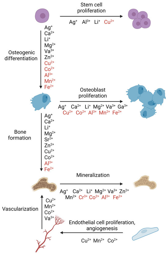 The importance of different bioactive ions during bone regeneration processes. Bioactive ions indicated in black improve the bone regeneration process, while bioactive ions indicated in red negatively influence bone regeneration [93].
