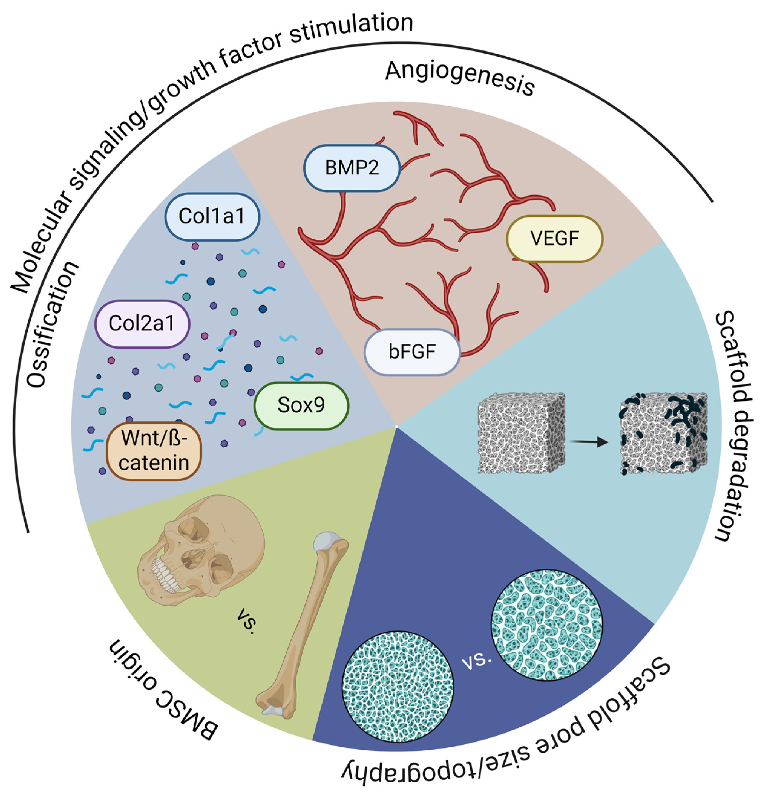 Summary figure of the crucial points of bone tissue engineering for clinical applications. The figure illustrates the various factors that can influence bone tissue regeneration: 1. The source of isolated stem cells plays a significant role in the regeneration process of maxillofacial bone. Stem cells derived from facial tissues are preferred over those from long bones, as they share a similar developmental origin. 2. The size and geometry of pores in scaffolds can affect their porosity, resistance to masticatory forces, and ability to promote bone ingrowth. 3. Scaffold degradation must be synchronized with accelerated tissue formation. Additionally, the degradation rate can be used to control the release of drugs, growth factors, and biomolecules. 4. Biomolecules that have crucial developmental roles can facilitate vascularization, cell differentiation, and the production of extracellular matrix (collagen type 1 alpha 1 chain (Col1a1), collagen type 2 alpha 1 chain (Col2a1), SRY-Box Transcription Factor 9 (Sox9), bone morphogenic protein (BMP), vascular endothelial growth factor (VEGF), fibroblast growth factor (FGF)).