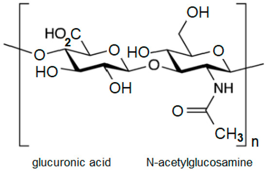 Hyaluronic acid is a glycosaminoglycan formed by repeating dimers of the disaccharide N-acetylglucosamine and glucuronic acid (Figure 1). The unique characteristic of this polysaccharide is its lack of association with protein structures and the absence of sulfated groups, which distinguishes it from other glycosaminoglycans.