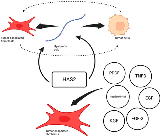 In tumor tissue, an increased level of HA synthesis is noted. When fibroblasts and breast cancer cells were co-cultivated, an increase in the expression of the HAS2 enzyme was noted on fibroblasts, which in turn increased the amount of synthesized HA (Figure 2). In this case, a certain protein synthesized by the cells of the tumor itself, C10 or f118, is indicated as a stimulus for HAS2 hyperexpression [39]. However, this is not the only example of the factors through which tumor cells are able to increase HA synthesis by fibroblasts. HAS2 expression is also regulated by interleukin-1β, FGF-2, PDGF, KGF, EGF, and TGF-β in tumor-associated fibroblasts [40,41].