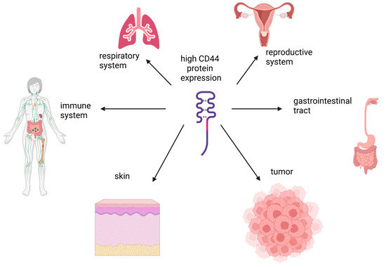 The tissues with high levels of CD44 protein expression. Created in BioRender. Pashkina, E. (2025) https://BioRender.com/z24i114.