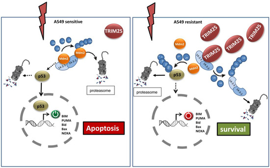 Proposed model of mechanisms underlying cisplatin resistance in non-small lung adenoma cells (A549/CDDP) (right panel) compared to drug sensitive parental A549 cells (left panel). Mechanistically, TRIM25-associated resistance to cis-CDDP is linked to an overexpression of TRIM25 but reduced levels of the scaffold protein 14-3-3σ, which itself is a target of TRIM25-dependent polyubiquitination and subsequent degradation by the proteasome. Consequently, the proteasomal degradation of the E3 ligase Mdm2 promoted by 14-3-3σ-dependent autoubiquitination (left panel) is impaired and leads to the facilitated proteolytic turnover of p53 and, finally, to a block in transcription of key apoptosis regulators by p53 and to resistance of cancer cells to drug-induced apoptosis. (Left panel) In contrast, low TRIM25 levels in A549 sensitive cells allow 14-3-3σ-accelerated autoubiquitination and degradation of Mdm-2, and thus, rescue p53 from Mdm2-triggered proteasomal degradation. Consequently, tumor cells are exposed to cisplatin, which induces nuclear import of p53, and subsequently, p53-dependent gene expression of pro-apoptotic factors. CDDP: cis-Diaminedichloroplatinum, Mdm2: murine double minute 2.