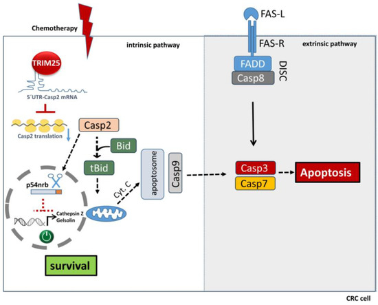 Postulated consequences of constitutive caspase-2 (Casp2) suppression by TRIM25 in colon carcinoma cells. (Left panel) Suppression of caspase-2 translation presumably results from constitutive TRIM25 binding to the 5’untranslated region (UTR) of caspase-2 mRNA and is functionally linked to impaired intrinsic apoptosis upon stimulation with chemotherapeutic agents, mainly due to the reduced cleavage of Bid and subsequent reduction in cytochrome c (cyt. C) release from mitochondria. In addition, impaired caspase-2 translation hinders the cleavage of the multifunctional protein p54nrb (NONO), and thereby, reinforces expression of tumorigenic genes, e.g., Cathepsin-Z and Gelsolin. Furthermore, this results in the impaired formation of apoptosome complexes and in the reduced activation of the executioner caspases-3 and -7 (Casp3, Casp7). (Right panel) As a further consequence, induction of the extrinsic and Fas ligand (FAS-L)- and caspase-8 (Casp8)-mediated apoptosis pathway by chemotherapeutic agents, e.g., doxorubicin, which converges on the activation of both executioner caspases, will be affected as well. Functionally, by increasing the thresholds for activation of both interconnected modes of apoptosis (intrinsic and extrinsic), TRIM25-mediated inhibition of caspase-2 translation may essentially contribute to the increased resistance of colon carcinoma cells towards chemotherapy-evoked apoptosis, and thus, constitute a so-far unrecognized survival program of tumor cells. Bid: BH3 interacting-domain death agonist, FADD: Fas-associated protein with death domain, FAS-R: FAS receptor, DISC: death-induced signaling complex.