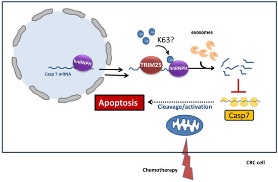 Inhibition of chemotherapy-induced apoptosis by TRIM25 via destabilization of caspase-7 (Casp7)-encoding mRNA. TRIM25, upon binding to the 3’UTR of caspase-7 mRNA and via binding and subsequent ubiquitination of the RNA binding protein hnRNPH1, suppresses the expression of caspase-7 mainly through destabilization of caspase-7 mRNA via exosome-triggered mRNA decay. The interaction of TRIM25 with hnRNAPH1 critically depends on RNA, thus indicating that caspse-7 mRNA serves as a “bridging RNA”, which facilitates physical interaction and ubiquitin-mediated posttranslational modification of hnRNPH1. Functionally, the reduction and impaired activation of caspase-7 (dotted arrow) critically contributes to increased resistance of CRC cells towards chemotherapeutic drug-induced intrinsic apoptosis. CRC: colon carcinoma cells; hnRNP: heterogeneous nuclear ribonucleoprotein; UTR: untranslated region.