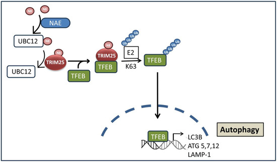 TRIM25 promotes autophagy-triggered resistance of triple-negative breast cancer cells to chemotherapy. Neddylation of TRIM25 by the E2 conjugating enzyme UBC12 increases the binding affinity of TRIM25 to TFEB due to neddylation-dependent conformational changes in TRIM25. Subsequently, TRIM25 promotes the nuclear import of TFEB via K63-linked ubiquitination, leading to the transcriptional induction of autophagy-related genes as depicted in the figure. Figure adopted from [122]. NAE: NEDD8 activating enzyme; TFEB: transcription factor EB; UBC12: ubiquitin conjugating enzyme E2M.