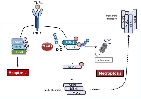Another mode of controlled cell death path which has attracted increased attention during the last decade is pyroptosis. It describes a lytic cell death modality which is especially relevant in the context of inflammation and infection and which is characteristically mediated by inflammatory caspases, including caspase-1, -4, and -5, and is executed by members of the gasdermin family [129]. Pyroptosis is characteristically initiated by activation of an oligomeric protein complex containing a sensor protein, an adaptor protein, and the zymogen procaspase-1 summarized as inflammasome [130,131,132]. Principally, the assembly of inflammasomes is induced in response to a divergent range of pathogen-associated or danger-associated molecular patterns (PAMPs and DAMPs, respectively). The canonical inflammasome leads to an induction of caspase-1, which itself is required for the proteolytic maturation and release of interleukin (IL)-1β and IL-18, summarized as the activation phase of inflammasome signaling upon their transcriptional induction by NFκB during the priming phase of inflammasome activation [133]. Previous studies have highlighted the pivotal role of inappropriate activation of the inflammasome in the pathogenesis of prominent inflammatory diseases [132]. In the context of cancer, pyroptosis is known to exert mainly tumor-suppressive functions [134]. Although the impact of inflammasome signaling was mainly described in macrophages, the relevance of inflammasome-triggered processes in other cells, e.g., the intestinal epithelial cells, is increasingly recognized. Hereby, epithelial cell pyroptosis can occur downstream of the intrinsic apoptotic pathway, emphasizing the fact that different modes of regulated cell death can be interconnected at multiple levels. Meanwhile, several studies could highlight the regulatory role in inflammasome-mediated inflammation, namely by the Nod-like receptor pyrin-domain containing protein-3 (NLRP3) inflammasome by different TRIM proteins [135]. Importantly, some of the TRIM members, including TRIM16, TRIM28, TRIM33, and TRIM62, can promote activation of NLRP3 inflammasome signaling, e.g., by increasing ROS-NFκB signaling, which results in the elevated expression of single members of the inflammasome, namely NLRP3, pro-Caspase-1, and apoptosis-associated speck-like protein containing CARD (ASC) (for a review, see [136]). In contrast, some TRIMs, including TRIM25, can impair NLRP3 signaling indirectly through upregulation of antioxidant protein expression via induction of the canonical Keap1/Nrf2/ARE pathway described before, which negatively interferes with NLRP3 activation by downregulation of ROS. In addition, a direct inhibition of NLRP3 signaling can be achieved through TRIM-dependent K48-linked ubiquitination and degradation of NLRP3 as exemplary shown for TRIM31 [137] and TRIM65 [106]. In a similar manner, TRIM25 attenuates doxorubicin-induced pyroptosis in cardiomyocytes by decreasing the stability of NLRP-1 via promoting its ubiquitination [138]. However, to the best of our knowledge, a direct modulatory role of TRIM25 in pyroptosis was not described in cancer cells. This is less surprising, since pyroptosis represents regulated cell death modality mainly relevant for innate immunity and host defense by cytokine-triggered activation of immune regulatory cells, and thus, it is mainly implied in the pathogenesis of inflammatory diseases. Likewise, TRIM25 negatively interferes with the activation of the receptor interacting kinase 3 (RIPK3) in HEK293 cells, and thereby, inhibits TNFα-induced necroptosis by promoting K48-linked polyubiquitination-dependent degradation of RIPK3 (Figure 8) [139]. Necroptosis represents a further non-apoptotic mode of the immunogenic cell death pathway, which is induced by different death receptors, including Fas, TNFR1, TRAILR1, and TRAILR2, and the pathogen recognition receptor (PRR) [6]. In the case of TNF-induced necroptosis, RIPK3 and its family relative RIPK1 form the necrosome core which assembles to heterodimeric fibrils, a process which is driven by phosphorylation but only under conditions when caspase-8 is inhibited or depleted [140]. Phosphorylated RIP3 subsequently phosphorylates its downstream target the pseudokinase mixed lineage kinase domain-like (MLKL), thereby promoting oligomerization and translocation of MLKL from the cytoplasm to the plasma membrane, which results in pore formation and cell lysis (Figure 8) [141]. While the study highlighted TRIM25 as a potential target for RIPK3-dependent necrosis-related diseases, the possible impact of regulation of this particular cell death modality by TRIM25 on the therapy resistance of tumor cells has not been addressed so far and awaits further investigations.