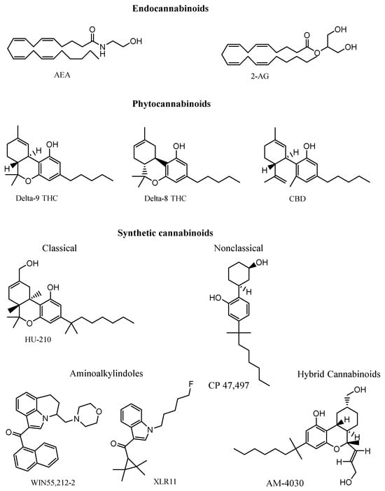 Endocannabinoids are natural agonists produced by the enzymes of neurons; phytocannabinoids are produced exclusively in the secondary metabolism of the Cannabis sativa plant; and synthetic cannabinoids, which are new molecules with a very wide structural diversity, are currently prohibited for synthesis, use, and distribution by the general public around the world. Abbreviations: AEA, anandamide; 2-AG, 2-arachidonoylglycerol; CBD, cannabidiol; THC, tetrahydrocannabinol.