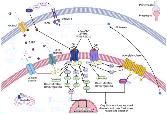 Signal transduction of CB1 and CB2. The postsynaptic neuron synthetizes and releases eCBs on the presynaptic terminal, where they bind to the cannabinoid receptors present in the presynaptic neuron. Once an eCB binds its receptor, there is a presynaptic inhibition of the Ca2+ flow, promoted by the inhibition of the CaV-type calcium channels and the activation of the G Protein-Coupled, Inward-Rectifying K+ (GIRK) channels. Additionally, the activation of the GIRK channels reduces calcium flow due to an increase in K+ conductance, producing hyperpolarization. This Ca2+ flow is responsible for a balance between the processes of Ca2+-dependent activation, such as muscle contraction and the release of neurotransmitters. Created with Biorender.com. Modified from Fletcher-Jones et al. (2020); Leo and Abood (2021); Gasperi et al. (2023) [23,32,33].