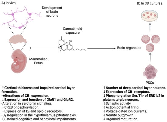 On the other hand, a study with phytocannabinoids, cannabidiol and THC, and synthetic analogs demonstrated that these compounds accelerated the neuronal and glial differentiation of bidimensional cultures of neurons derived from human iPSCs. The phytocannabinoids and their analogs decreased calcium signaling in neurons, which is consistent with the evidence that demonstrates that exogenous cannabinoids alter neuronal activity. Remarkably, only the synthetic analog THJ-018 induced a modest increase in cell death in neuronal cultures derived from human iPSCs [134]. This information suggests that while cannabinoids and their analogs promote cellular impairments, including altered neuronal activity or increased rate of differentiation, their potential to induce neuronal death is minimal in human neurons. The discrepancies in the results regarding neuronal differentiation with the previous studies may be attributed to the different protocols of neuronal differentiation, since this research group did not use a protocol to yield a culture enriched with cortical neurons. However, after taking all this information together, there is robust evidence indicating that exogenous cannabinoids impair neuronal activity in cortical neurons by decreasing it, presumably through morphological alterations of glutamatergic neurons; moreover, both in vivo animal and in vitro organoid studies suggest that the effect of cannabinoids on neurogenesis has a significant negative impact on glutamatergic cortical neurons directly associated with cognitive and behavioral development (Figure 3).
