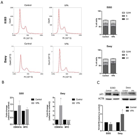 We measured the cell cycle distribution in MB cells after VPA exposure. Again, consistently with the previous study by Li et al. [29], VPA induced G1 arrest in the Daoy cells (p < 0.05) (Figure 2A). To better understand how VPA influences cell cycle progression, we examined the expression of CDKN1A, the gene that encodes cell cycle regulator protein p21, and MYC, which encodes the MYC transcription factor. CDKN1A and MYC levels were not significantly altered in the D283 cells. In the Daoy cells, VPA was able to increase the transcriptional levels of CDKN1A (4.2-fold, p < 0.05) while reducing MYC (0.7-fold, p < 0.0001) (Figure 2B). In addition, the p21 protein levels were slightly reduced in the VPA-treated D283 cells (0.78-fold, p < 0.05) and significantly increased in the Daoy cells (1.97-fold, p < 0.05) (Figure 2C).