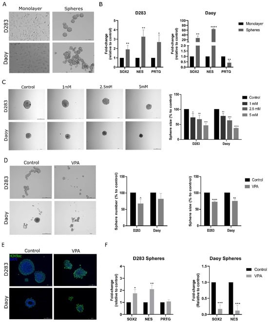 To elucidate whether VPA could influence MB neurosphere formation, we measured the neurosphere size after growth in the presence of VPA (1.0, 2.5, or 5.0 mM). All concentrations tested significantly reduced the neurosphere size after 5 days of VPA exposure compared to the controls in both cell lines (Figure 3C). We also examined whether VPA could reduce the size and number of neurospheres. After 5 days of neurosphere formation, neurospheres were treated with VPA (2.3 mM for D283 and 2.2 mM for Daoy) for 48 h. VPA reduced the D283 neurosphere size by 27% (p < 0.0001 compared to the controls) and number by 33% (p < 0.05 compared to the controls). In Daoy, VPA reduced the neurosphere size by 25.5% (p < 0.01 compared to the controls; Figure 3D). The immunofluorescence assay in MB neurospheres indicated that VPA at concentrations that impair MB neurosphere viability is also able to enhance H3K9ac (Figure 3E). After VPA treatment, the D283 neurospheres showed an increase in SOX2 and NES (1.7-fold, p < 0.05 for SOX2 and 2.0-fold, p < 0.01 for NES) whereas the PRTG levels were not significantly changed. In the Daoy spheres, the reduction in neurosphere viability was accompanied by a decrease in the SOX2 and NES levels (0.2-fold, p < 0.001 for SOX2 and 0.2-fold, p < 0.001 for NES) (Figure 3F).
