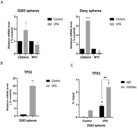 VPA increased the CDKN1A levels in the MB neurospheres (1.9-fold, p < 0.05 in D283 and 7-fold, p < 0.0001 in the Daoy-derived neurospheres) and decreased the MYC levels in both the D283 (0.7-fold, p < 0.05) and Daoy neurospheres (0.2-fold, p < 0.01) (Figure 4A). In the D283 neurospheres, VPA also increased the TP53 levels (20-fold, p < 0.01) (Figure 4B) Moreover, the ChIP-qPCR results indicated that TP53 may be epigenetically modulated by VPA in the D283 neurospheres (Figure 4C).