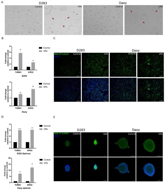 Exposure to VPA was accompanied by morphological changes consistent with differentiation in the MB cells (Figure 5A). We measured the transcriptional levels of neuronal differentiation markers TUBB3 and ENO2 and found that VPA increased the expression of both markers in the D283 (5.6-fold, p < 0.01 for TUBB3 and 2.5-fold, p < 0.01 for ENO2) and Daoy cells (1.4-fold, p < 0.01 for TUBB3 and 2-fold, p < 0.01 in ENO2; Figure 5B). In the MB-derived neurospheres, VPA also increased both markers (D283-derived neurospheres, 2.9-fold, p < 0.0001 for TUBB3 and 2-fold, p < 0.001 for ENO2; Daoy-derived neurospheres, 7.1-fold, p < 0.01 for TUBB3 and 13.1-fold, p < 0.01 for ENO2; Figure 5D). Immunofluorescence was used to detect the beta III tubulin protein levels after VPA exposure in the MB monolayer cells and neurospheres (Figure 5C,E).