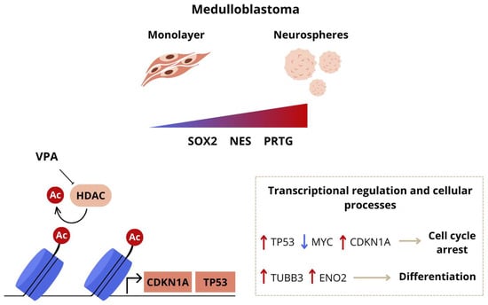Schematic model highlighting selected aspects of VPA-induced molecular and functional effects in MB. Exposure to VPA leads to a reduction in MB cell cycle arrest and differentiation in the MB monolayer and neurospheres. VPA can increase TP53 while reducing MYC expression, potentially inhibiting stemness and promoting features of differentiation.