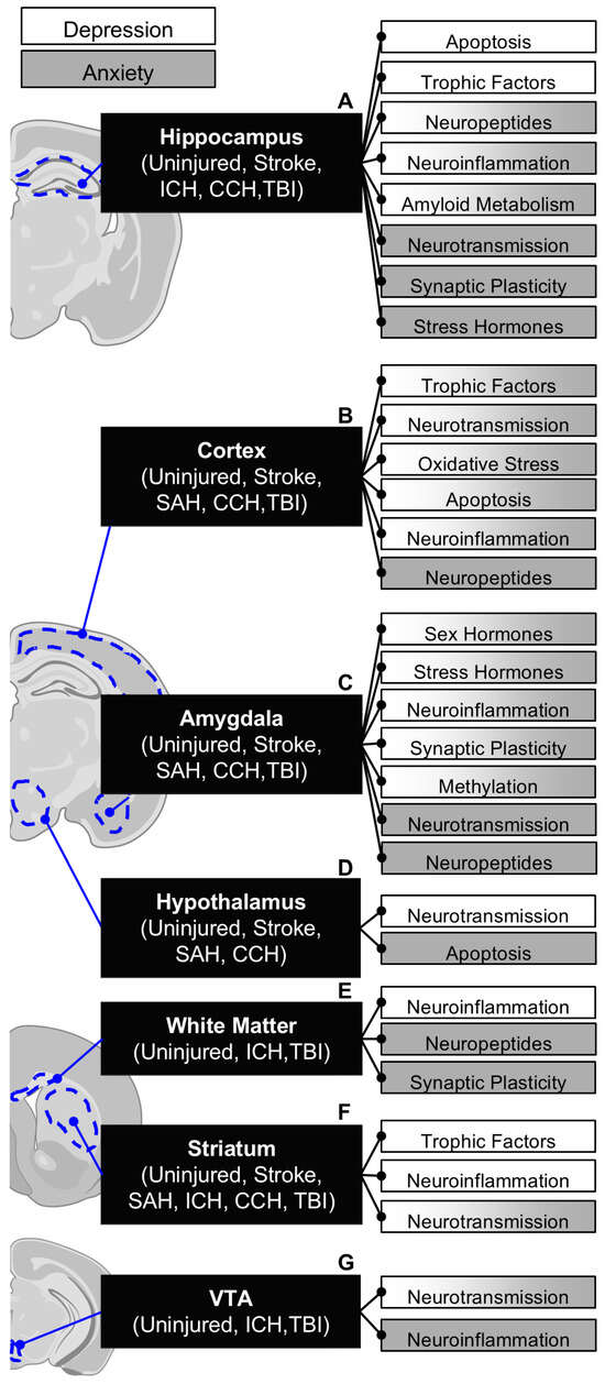 | Astrocytosis, microgliosis → Anxiety and depression | ICH (depression): White matter Hippocampus Striatum ICH (anxiety and depression): Ventral tegmental area | ICH TBI Stroke | [17,24,73,74,75,76] | ||