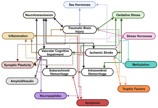 | Neuroinflammation | ↑TNF-α, IL-1B, IL-6, and NF-κB → Anxiety and depression | ICH: Estrogen modulates astrocytic-mediated inflammation and the presentation of depression | N/A | TBI ICH | [17,72,73] |