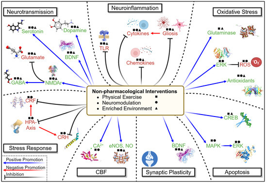 | Apoptosis | P38-MAPK, ↓ERK, Akt/mTOR → ↓neurons → anxiety, compulsive-like behaviors, and decreased activity levels. | N/A | ERK, SAH: Hypothalamus Parietal–entorhinal cortex | SAH Ischemic stroke | [65,66,67,68] |