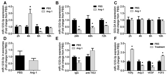 Ang-1 regulates miR-1233-3p in HUVECs. (A,B) miR-1233-3p levels measured in HUVECs exposed for 2, 4, 6, 10, 24, 48, and 72 h to PBS or Ang-1 (300 ng/mL). (C) Expression of GOLGA8A mRNA in HUVECs exposed for 2, 4, 6, and 10 h to PBS or Ang-1. (D) Levels of miR-1233-3p in HUVEC exosomes after 24 h of PBS or Ang-1 (300 ng/mL) treatment. (E) Expression levels of miR-1233-3p in HUVECs treated with control or Tie-2 blocking antibodies and incubated with PBS or Ang-1 (300 ng/mL) for 24 h. (F) Expression of miR-1233-3p in HUVECs treated PBS or growth factors (TGFβ, Ang-2, VEGF and FGF-2) for 24 h. Values are expressed as means± SEM and are expressed as fold change from PBS. * p < 0.05, compared with PBS.