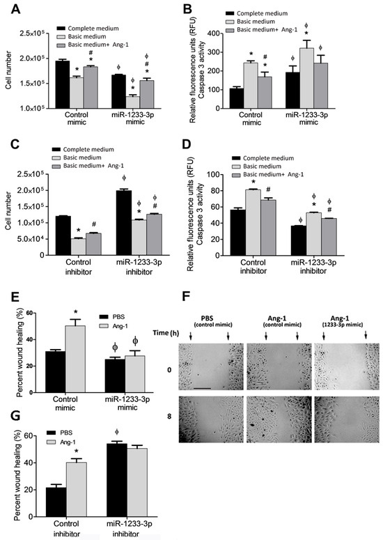Regulation of cell survival and migration by miR-1233-3p and Ang-1. (A,B) HUVECs transfected with control or miR-1233-3p mimics were maintained in complete medium, basic medium+FBS, or basic medium + Ang-1. (C,D) HUVECs transfected with control or miR-1233-3p inhibitors were maintained in complete medium, basic medium+ FBS, or basic medium + Ang-1. (E,F) Percentage wound healing and representative images of HUVECs transfected with control or miR-1233-3p mimics and treated with PBS or Ang-1 (300 ng/mL) for 8 h. (G) Percentage wound healing of HUVECs transfected with control or miR-1233-3p inhibitors and treated with PBS or Ang-1 (300 ng/mL) for 8 h. Values are means ± SEM. * p < 0.05, compared to PBS alone. # p < 0.05, compared to basal medium. ϕ p < 0.05, compared to cells transfected with control mimic or control inhibitor. Scale bar in panel F = 100 µm.