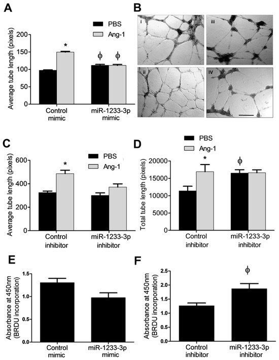 Effects of miR-1233-3p on EC differentiation and proliferation by miR-1233-3p. (A) The average tube lengths of capillary-like tube formation in HUVECs transfected with the control and miR-1233-3p mimic in the presence of PBS or Ang-1. Values are means ± SEM. (B) Representative images of capillary-like tube formation in cells transfected with control mimic in the presence of PBS (i) or Ang-1 (ii). Also shown are HUVECs transfected with the miR-1233-3p mimic in the presence of PBS (iii) or Ang-1 (iv). (C,D) The average and total tube lengths of cells transfected with the control and miR-1233-3p inhibitors in the presence of FBS or Ang-1. (E,F) BrdU incorporation in HUVECs transfected with the control and miR-1233-3p mimics or inhibitors in the presence of PBS. Values are means ± SEM. * p < 0.05, compared to PBS alone. ϕ p < 0.05, compared to cells transfected with control mimic or control inhibitor. Scale bar in panel B = 200 µm.