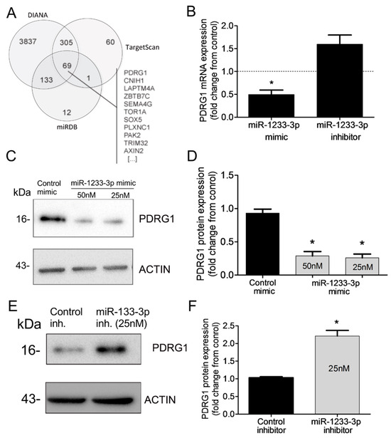 Identification of PDRG1 as miR-1233-3p target. (A) Venn diagram displaying in silico predicted targets of miR1233-3p as computed by DIANA, TargetScan, and miRDB algorithms. (B) PDRG1 mRNA expression in HUVECs transfected with miR-1233-3p mimic or inhibitor and their respective controls (denoted by dotted line). Values are expressed as fold change from control mimic and inhibitor. (C,D) Representative immunoblots of PDRG1 and β-ACTIN proteins and quantification of PDRG1 protein levels in HUVECs transfected with control or miR-1233-3p mimics. Values are means± SEM and are expressed as fold change from control mimic. (E,F) Representative immunoblots of PDRG1 and β-ACTIN proteins and quantification of PDRG1 protein levels in HUVECs transfected with control or miR-1233-3p inhibitors. Values are means± SEM and are expressed as fold change from control inhibitor. * p < 0.05, compared to control mimic or inhibitor.