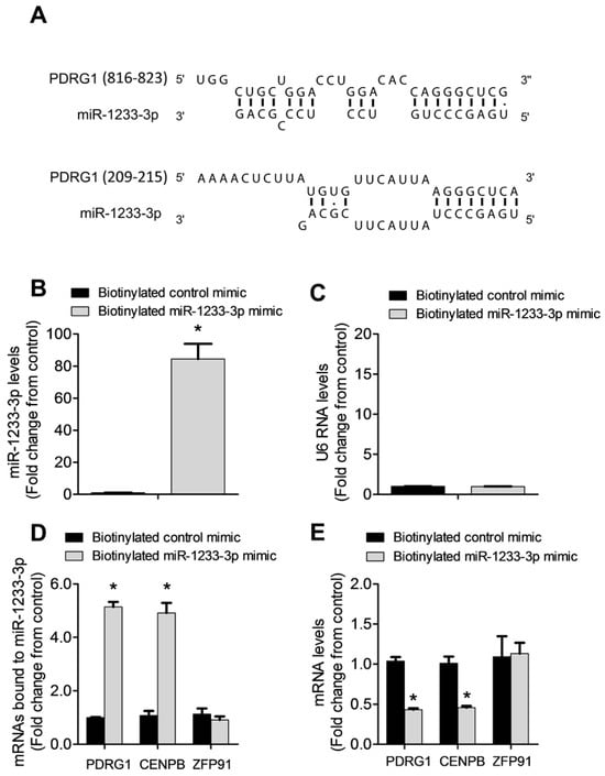 PDRG1 is a direct target of miR-1233-3p. (A) A schematic representation of the sequence alignment of miR-1233-3p and the predicted binding sites according to the DIANA algorithm on the 3′ UTR of PDRG1 mRNA. The numbers between the brackets indicate the nucleotide number of 3’ UTR of PDRG1. (B–D) Biotinylated miR-1233-3p pull-down assays. (B,C) Illustrate the levels of miR-1233-3p and U6 RNA after the transfection of 50 nM biotinylated control or miR mimics in HUVECs. Values are expressed as a fold change from the control mimic. (D) Shows mRNA levels of PDRG1, HOXB3, and ZFP91 detected with qPCR in the pull-down materials isolated from HUVECs transfected with the biotinylated control or miR-1233 mimics. Values are expressed as a fold change from the control mimic. (E) The levels of PDRG1, HOXB3, and ZFP91 mRNA in the total input mRNAs measured by qPCR. Enrichment was calculated as follows: X = miR pull-down/control pull-down. Y = miR input/control input. Fold binding = X/Y. Values are expressed as means ± SEM. * p < 0.05, compared to the biotinylated control mimic.