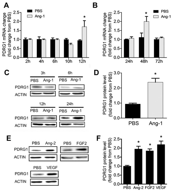 Ang-1 regulates PDRG1 expression. (A,B) PDRG1 mRNA levels in HUVECs treated with PBS or Ang-1 (300 ng/mL) for 2, 4, 6, 10, 12, 24, 48, and 72 h. (C) Representative immunoblots of PDRG1 protein in HUVECs exposed to PBS or Ang-1 for 3, 6, 12, and 24 h. (D) Mean values of PDRG1 protein levels in HUVECs exposed to PBS or Ang-1 for 24 h. (E,F) Representative immunoblots of PDRG1 and β-ACTIN proteins and mean values of PDRG1 protein levels in HUVECs exposed for 24 h to PBS, Ang-2 (300 ng/mL), FGF-2 (10 ng/mL), or VEGF (40 ng/mL). Values are expressed as means± SEM and are expressed as a fold change from PBS. * p < 0.05, compared to PBS.
