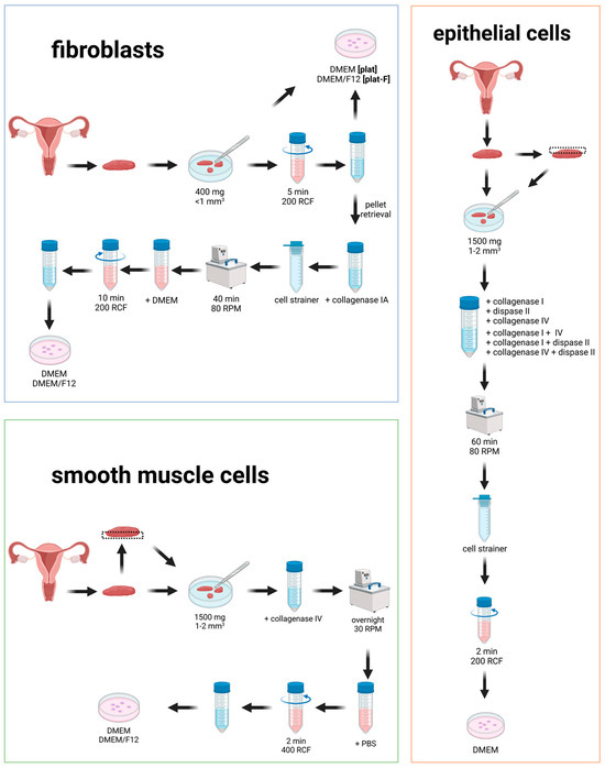 Isolation protocols were tested for fibroblasts (blue), smooth muscle cells (green), and epithelial cells (orange) from human vaginal wall tissue. This illustration provides a schematic overview of the tested protocols.