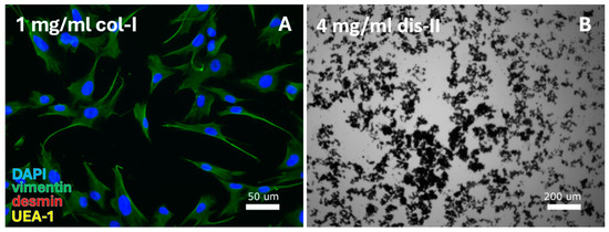 VEC-specific protocols were tested for digestion by a range of collagenase-I (col-I), collagenase-IV, and dispase-II (dis-II) concentrations. This resulted in (A) isolation of fibroblasts from the cell pellet after digestion with 1 mg/mL collagenase-I and (B) cell debris for use of high (2 or 4 mg/mL) dispase-II concentrations or combined use of dispase-II, collagenase-I, and collagenase-IV. DAPI = cell nuclei (blue), vimentin = fibroblasts (green), desmin = smooth muscle cells, and UEA-1 = endothelial cells (yellow).
