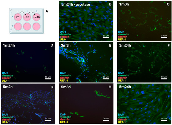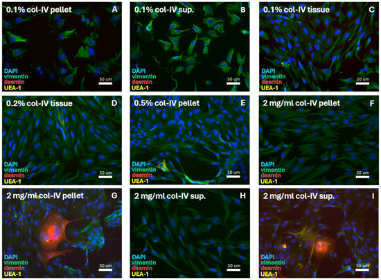 Figure 3. SMC-specific protocols were tested for digestion using a range of collagenase-IV (col-IV) concentrations. This resulted in isolation of FBs. With 0.1% col-IV and culturing in DMEM, FBs were retrieved from the (A) pellet, (B) supernatant (sup.), and (C) tissue. FBs were also retrieved through culturing in DMEM/F12 after isolation with (D) 0.2% col-IV from the tissue and (E) 0.5% collagenase-IV from the pellet. Digestion with 2 mg/mL col-IV resulted in FBs from (F) the pellet, with (G) the sporadic detection of muscle cells at quantities <5%, and from (H) the supernatant, with (I) the sporadic detection of muscle and epithelial cells at quantities <5%. DAPI = cell nuclei (blue), vimentin = fibroblasts (green), desmin = smooth muscle cells, and UEA-1 = endothelial cells (yellow). - 0.2% collagenase-IV: isolation in DMEM/F12 from tissue.