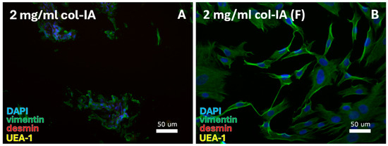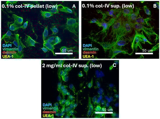 Cells were seeded on Nunc Lab-Tek 8-well Chamber Slides, fixed, and stained according to the description for vimentin, desmin, and UEA-1. The slides were incubated with cytokeratin-19 (ThermoFischer Scientific, mouse mAb, 1:20 concentration, overnight incubation at 4 °C) to identify VECs, and counterstained with DAPI. After a 5 min PBS wash, the slides were embedded with Prolong Gold Antifade Reagent, hardened 1 h at RT, and placed at 4 °C for a few hours before analysis with an Olympus BX 41 light microscope.